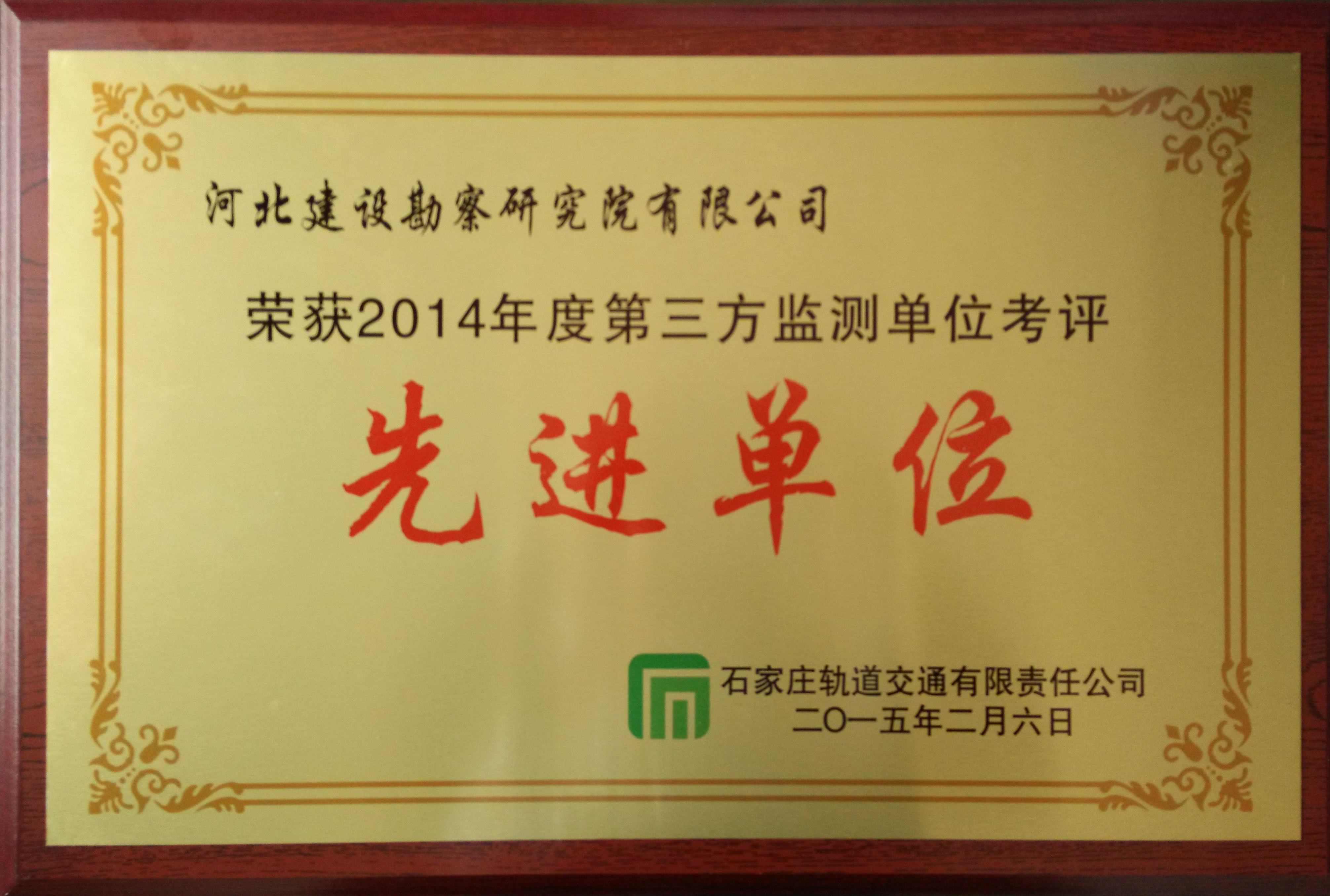 近日,我公司被石家莊軌道交通有限責任公司評為2014年度第三方監測單位考評先進單位。