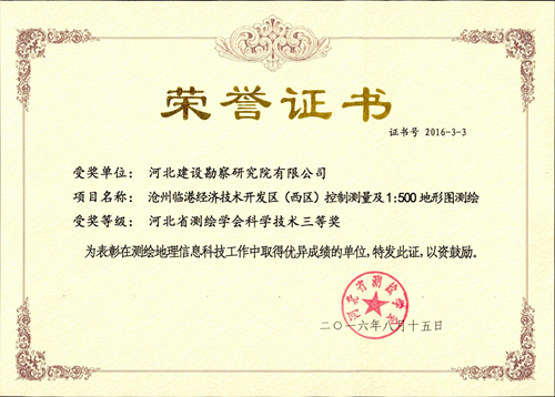 8月5日,我公司承擔的任丘市城鄉規劃局基礎測繪項目1、2標段被河北省測繪學會評為河北省優秀地理信息工程一等獎;8月15日,我公司承擔的滄州臨港經濟技術開發區(西區)控制測量及1∶500地形圖測繪項目被河北省測繪學會評為河北省測繪學會科學技術三等獎。