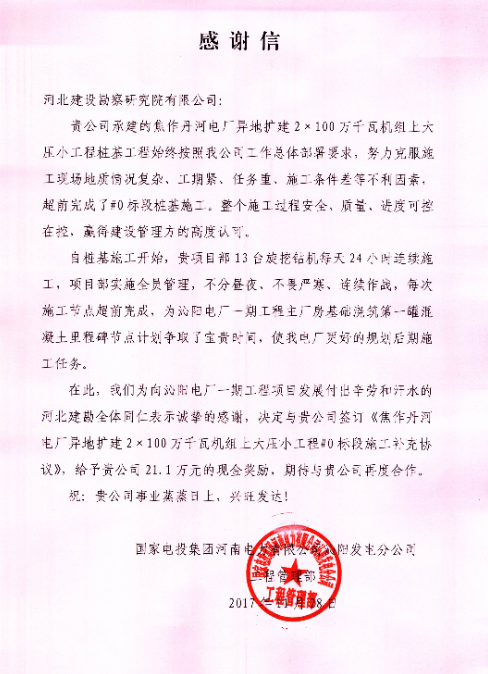 我公司承建的焦作丹河電廠異地?cái)U(kuò)建2×100萬千瓦機(jī)組上大壓小工程樁基工程,始終按照業(yè)主工作總體部署要求,努力克服施工現(xiàn)場地質(zhì)情況復(fù)雜、工期緊、任務(wù)重、施工條件差等不利因素,超前完成了#0標(biāo)段樁基施工,整個(gè)施工過程安全、質(zhì)量、進(jìn)度可控在控,贏得了建設(shè)管理方的高度認(rèn)可。11月28日,國家電投集團(tuán)河南電力有限公司沁陽發(fā)電分公司工程管理部發(fā)來感謝信,對(duì)我公司項(xiàng)目部員工表示感謝,并期待與我公司的再度合作。