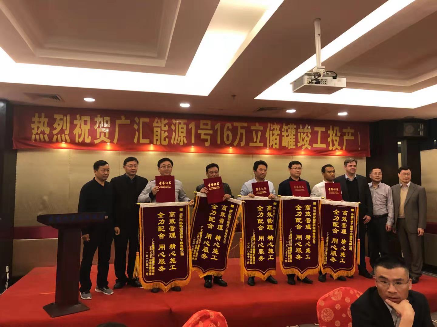 2018年11月21日,廣匯能源1號(hào)16萬(wàn)m³儲(chǔ)罐項(xiàng)目順利投產(chǎn),并創(chuàng)造了LNG行業(yè)新的記錄。在竣工投產(chǎn)慶功會(huì)上,廣匯能源總經(jīng)理和TGE總經(jīng)理對(duì)我公司在項(xiàng)目中的突出貢獻(xiàn)給予了高度贊揚(yáng),并授予錦旗和“優(yōu)秀分包商”證書,同時(shí)也對(duì)我公司在2號(hào)16萬(wàn)立方儲(chǔ)罐施工過(guò)程中的優(yōu)秀表現(xiàn)提出了表?yè)P(yáng),并期望我公司更多的參與廣匯能源的項(xiàng)目建設(shè)。