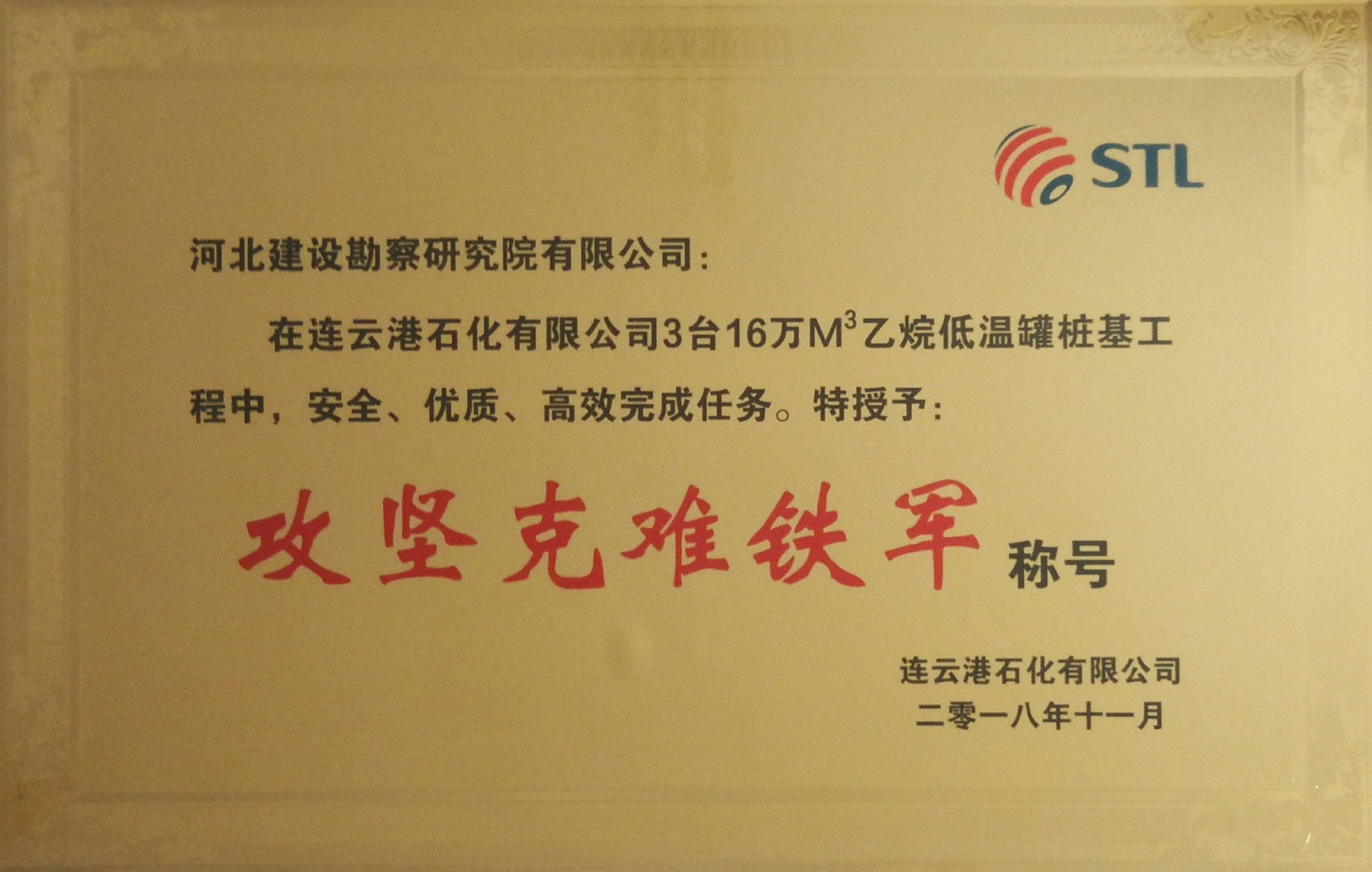 連云港石化有限公司320萬噸/年輕烴低溫儲(chǔ)罐樁基工程榮獲“攻堅(jiān)克難鐵軍”稱號(hào)