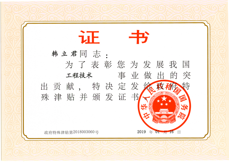 經石家莊市人力資源和社會保障局選拔,河北省人力資源和社會保障廳推薦,人力資源和社會保障部組織評審,中華人民共和國國務院批準,公司董事長韓立君入選國務院政府特殊津貼專家。