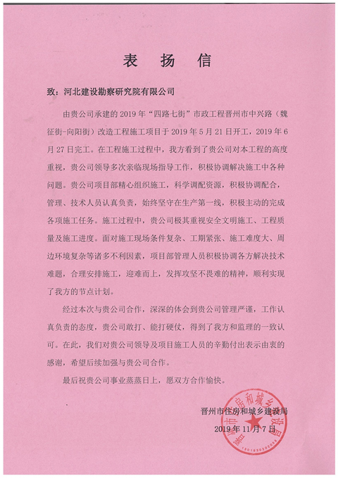 我公司承建的2019年“四路七街”市政工程晉州市中興路(魏征街-向陽(yáng)街)改造工程,在施工過(guò)程中,項(xiàng)目部精心組織策劃,科學(xué)調(diào)配資源,主動(dòng)認(rèn)真負(fù)責(zé),始終堅(jiān)守在生產(chǎn)第一線(xiàn),確保了工期、質(zhì)量、安全,順利實(shí)現(xiàn)了業(yè)主的節(jié)點(diǎn)計(jì)劃,得到了業(yè)主和監(jiān)理的一致認(rèn)可,為晉州的后續(xù)市場(chǎng)開(kāi)拓出了新局面。