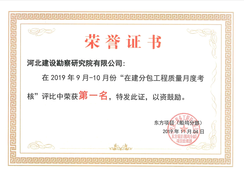我公司俄羅斯東方船廠項目部,在2019年9月-10月份整個東方船廠項目十幾家施工單位質量月度考核評比中,榮獲第一名的好成績