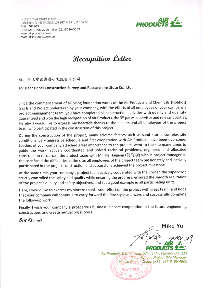 我公司承建的美國AP公司大型氣體島項目,安全、優質完成了全部地基處理任務。施工期間克服天氣寒冷、工期緊等因素,投入旋挖鉆機8臺套,一個月完成灌注樁20000立方,取得了業主的一致好評。