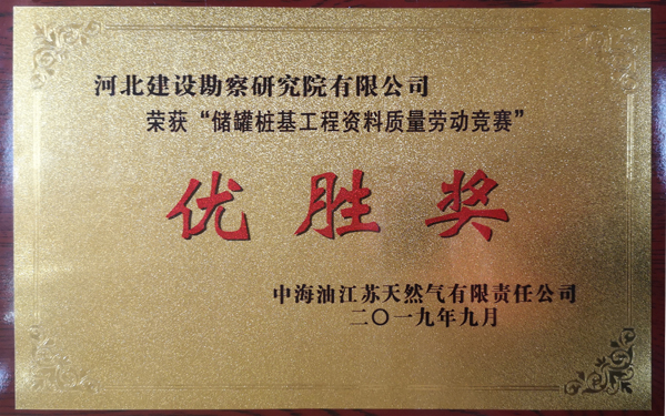 由我公司承建的江蘇液化天然氣(LNG)接收站1#、2#儲罐樁基工程已于2019年09月01日施工完成,2019年12月01日全部檢測完成,樁基檢測結果全為Ⅰ類樁。在施工期間的質量安全管理及我公司項目部的工作作風和工作態度受到了總包、監理及業主單位的充分肯定。在江蘇液化天然氣(LNG)接收站工程項目完工之際,為我公司頒發了“優秀承包商”證書。在建設單位組織的“儲罐樁基工程資料質量勞動競賽”中,通過項目部的努力及公司的全力幫助,獲得優勝獎。