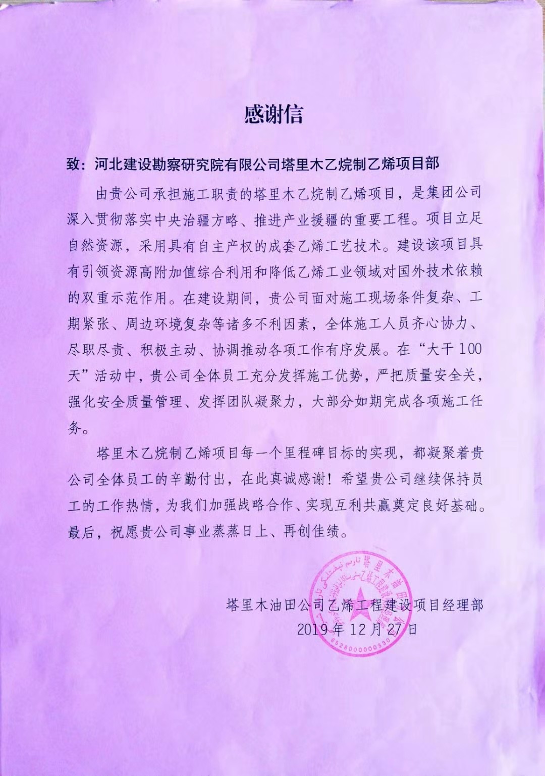 公司近日收到業(yè)主塔里木油田公司乙烯工程建設(shè)項(xiàng)目經(jīng)理部的感謝信及中國(guó)寰球工程有限公司北京分公司的質(zhì)量管理先進(jìn)集體錦旗。在建設(shè)期間,我公司面對(duì)現(xiàn)場(chǎng)條件復(fù)雜、工期緊張等諸多不利因素,全體施工人員齊心協(xié)力、盡職盡責(zé)、積極主動(dòng)、協(xié)調(diào)推動(dòng)各工作有序開(kāi)展,在施工中,嚴(yán)把質(zhì)量安全觀、強(qiáng)化安全質(zhì)量管理、發(fā)揮團(tuán)隊(duì)凝聚力,很好的完成了各項(xiàng)施工任務(wù),為雙方進(jìn)一步加強(qiáng)戰(zhàn)略合作、實(shí)現(xiàn)互利共贏奠定了良好基礎(chǔ)。