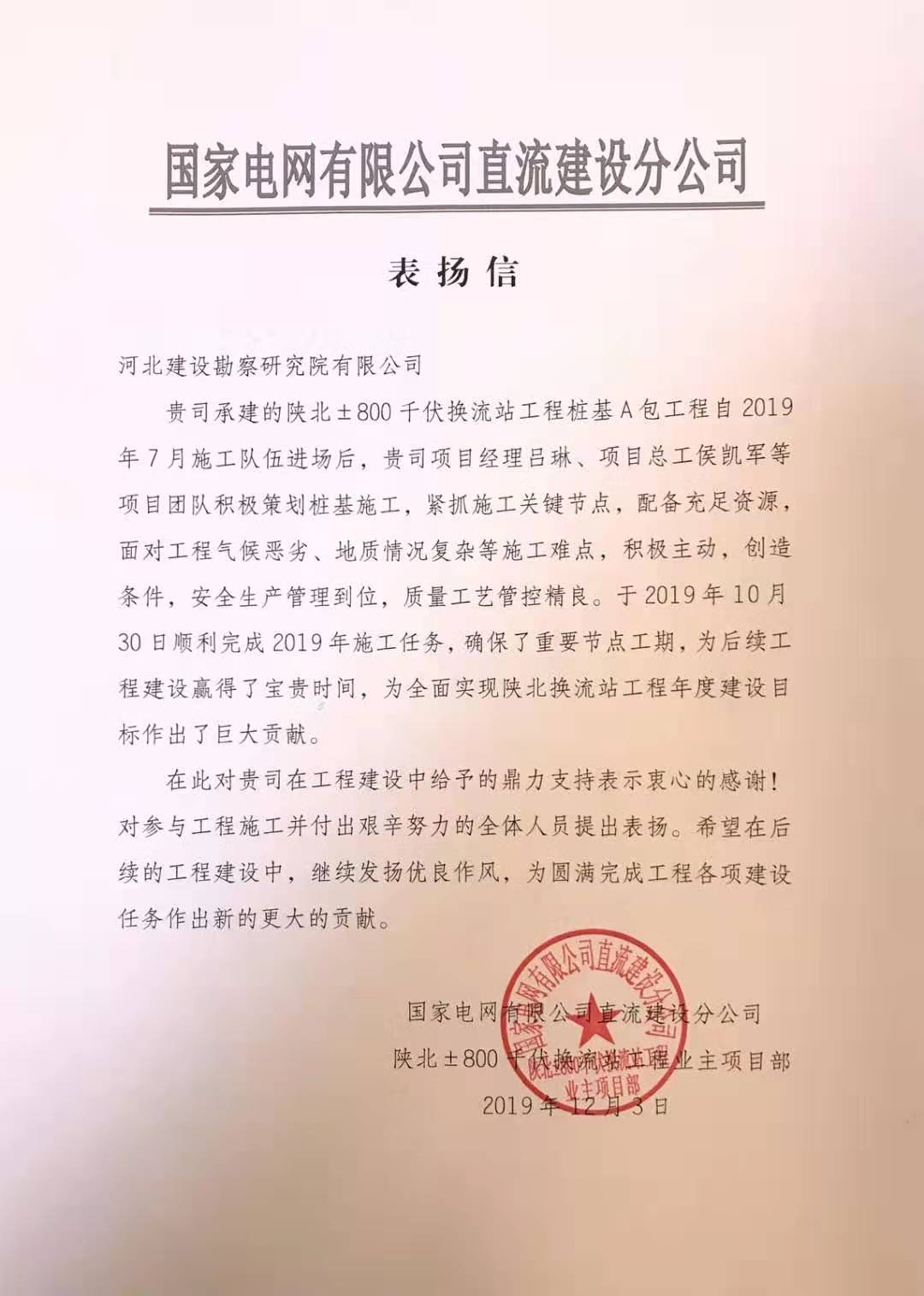 另有陜北換流站項(xiàng)目部也收到國(guó)家電網(wǎng)直流建設(shè)分公司的感謝信,該項(xiàng)目自2019年7月進(jìn)場(chǎng)后,在項(xiàng)目經(jīng)理呂琳、項(xiàng)目總工侯凱軍等精心組織和艱苦努力下,順利完成施工任務(wù),確保了重要節(jié)點(diǎn)工期,為后續(xù)工程建設(shè)贏得了寶貴時(shí)間,為全面實(shí)現(xiàn)陜北換流站工程年度建設(shè)目標(biāo)作出巨大貢獻(xiàn),受到業(yè)主的充分肯定和高度表?yè)P(yáng)。