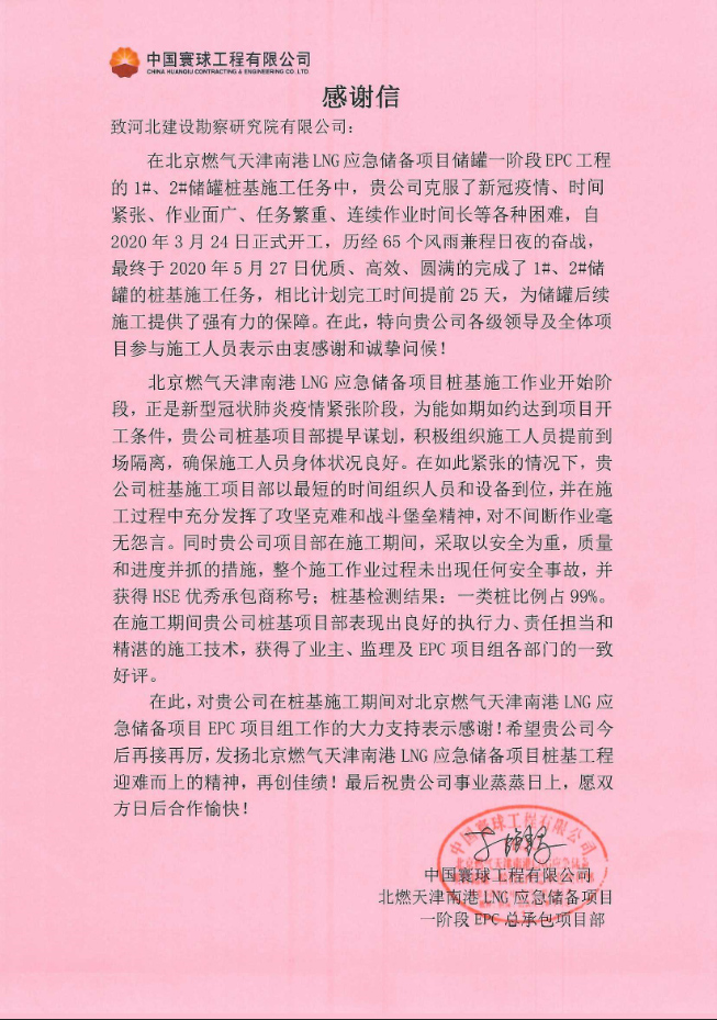 由我公司承建的北京燃?xì)馓旖蚰细跮NG應(yīng)急儲(chǔ)備項(xiàng)目1#、2#儲(chǔ)罐樁基工程,自2020年3月24日正式開(kāi)工,歷經(jīng)65個(gè)日夜的奮戰(zhàn),最終于2020年5月27日優(yōu)質(zhì)、高效、圓滿的完成了1#、2#儲(chǔ)罐的樁基施工任務(wù)。中國(guó)寰球工程有限公司北京燃?xì)馓旖蚰细跮NG應(yīng)急儲(chǔ)備項(xiàng)目?jī)?chǔ)罐一階段EPC項(xiàng)目組,對(duì)我公司北燃樁基項(xiàng)目組表示由衷的感謝,感謝我公司領(lǐng)導(dǎo)及全體項(xiàng)目施工人員的辛勤付出,在克服了新冠疫情、時(shí)間緊張、作業(yè)面廣、任務(wù)繁重、連續(xù)作業(yè)時(shí)間長(zhǎng)等各種困難的情況下,奮勇向前,較原定工期提前25天完成施工任務(wù),為項(xiàng)目后續(xù)施工帶來(lái)了強(qiáng)有力的工期保障。同時(shí)對(duì)我公司在樁基施工期間對(duì)北京燃?xì)馓旖蚰细跮NG應(yīng)急儲(chǔ)備項(xiàng)目EPC項(xiàng)目組工作的大力支持表示感謝!希望我公司今后再接再厲,繼續(xù)發(fā)揚(yáng)迎難而上的精神,再創(chuàng)佳績(jī)!