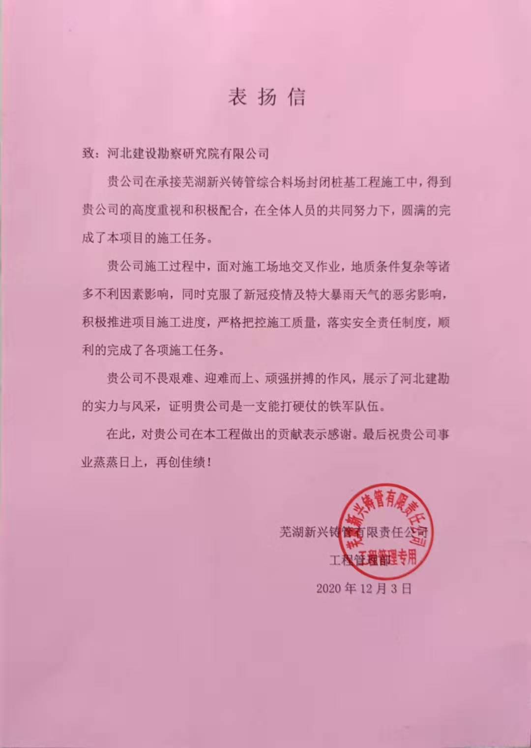 近日,公司收到蕪湖新興鑄管有限責任公司發來的表揚信,對我公司在蕪湖新興鑄管綜合料場封閉樁基施工過程中,面對施工場地交叉作業,地質條件復雜等諸多不利因素,同時克服了新冠疫情及特大暴雨天氣的惡劣影響,順利完成了各項施工任務,給予了充分的肯定,并表示感謝!