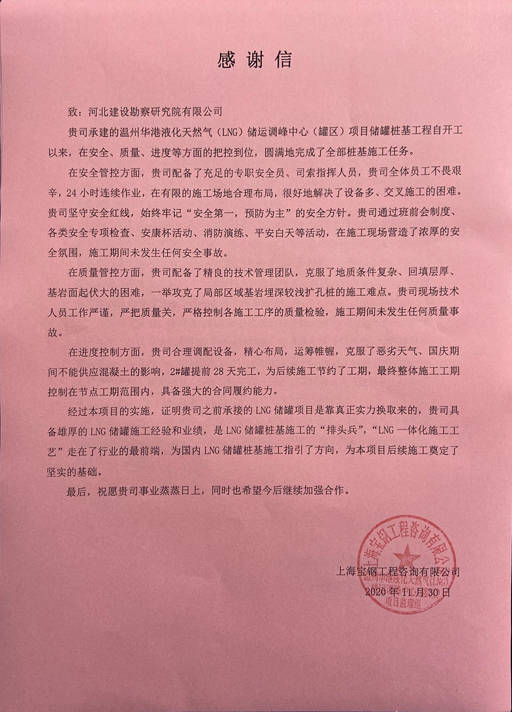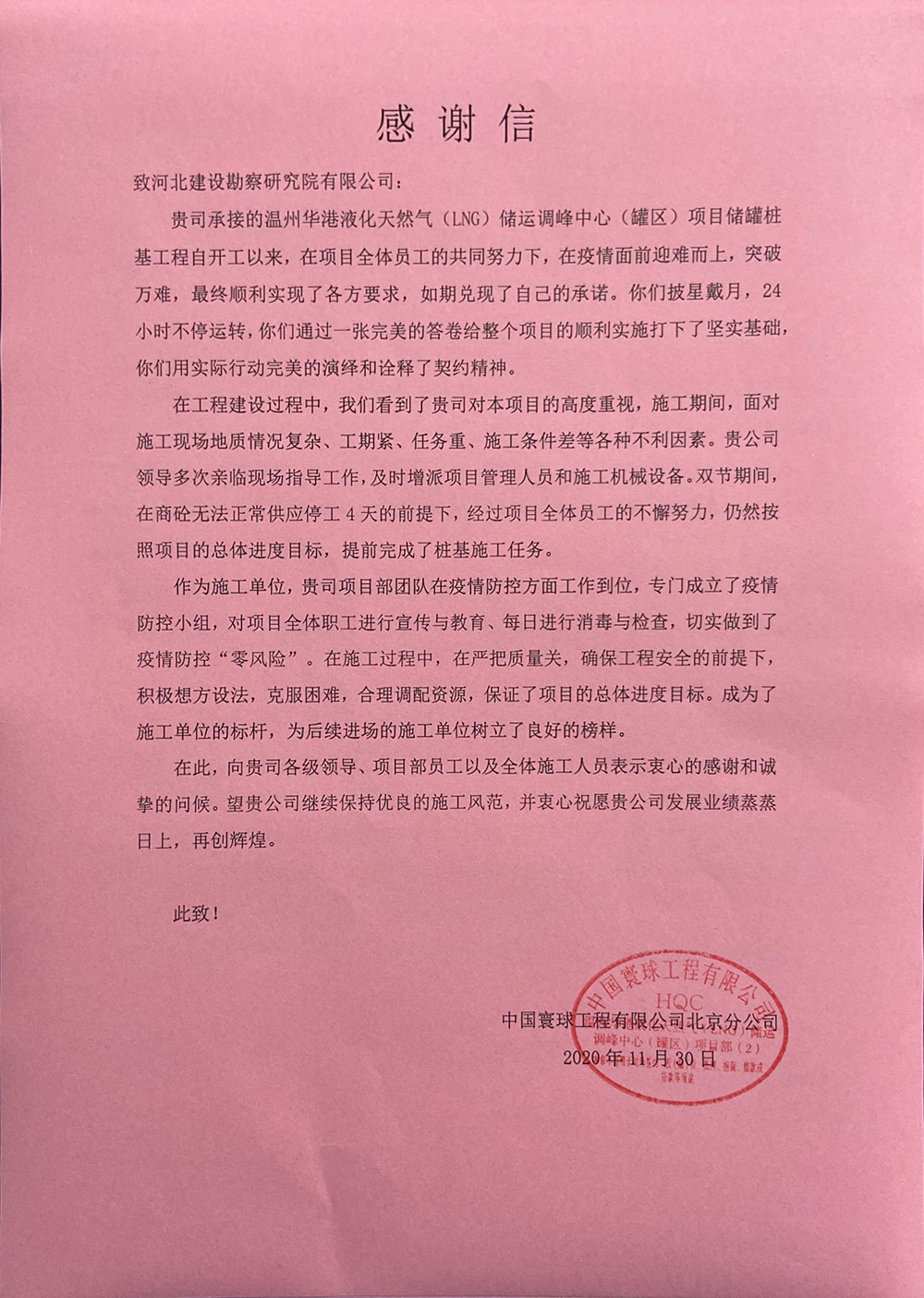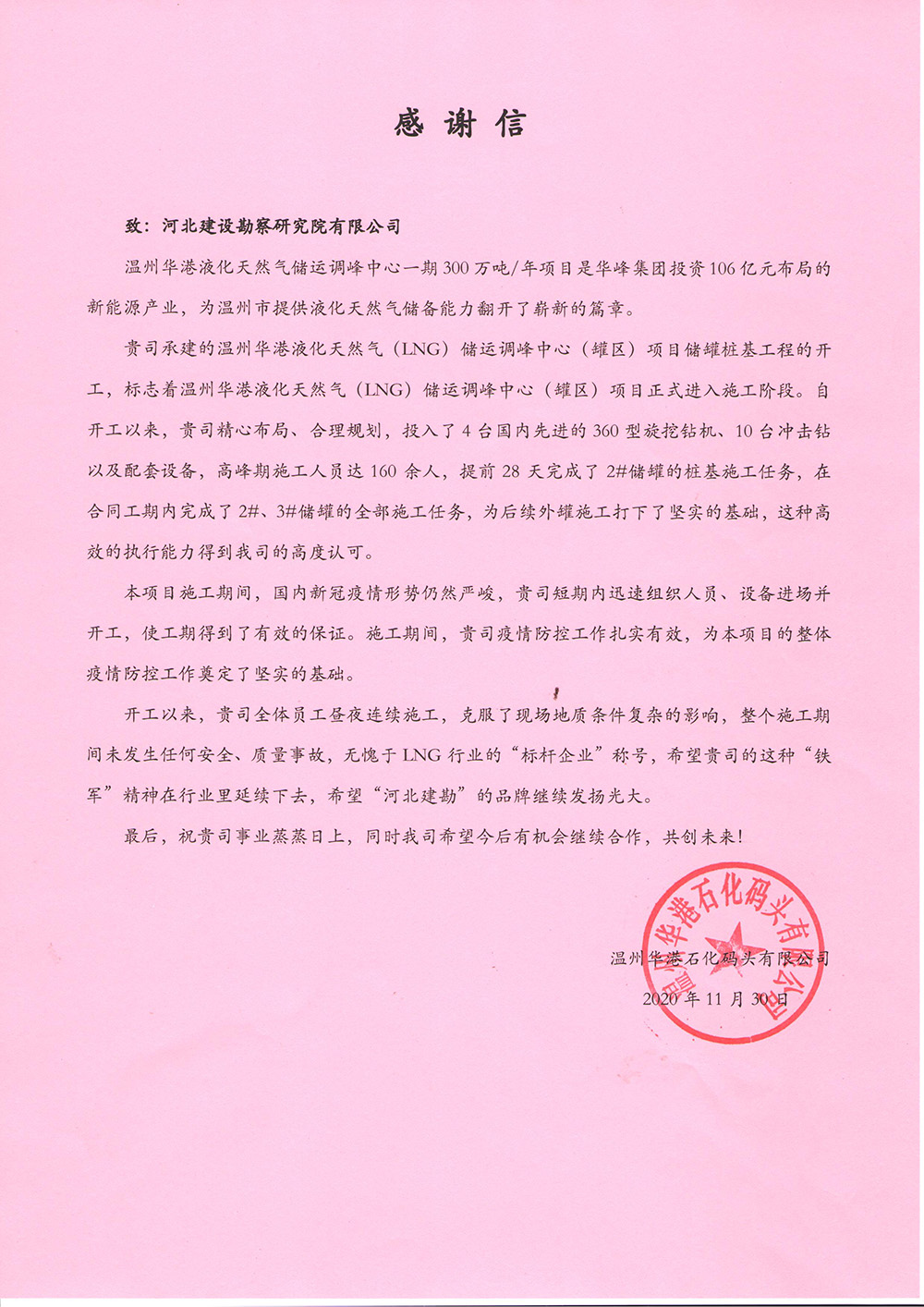 近日我公司溫州華港LNG項目部喜獲業主、總包、監理的表揚信,這是對項目部全體參建人員不畏艱難、頑強拼搏、攻堅克難的施工精神的認可和贊揚,更是對河北建勘高度的肯定。