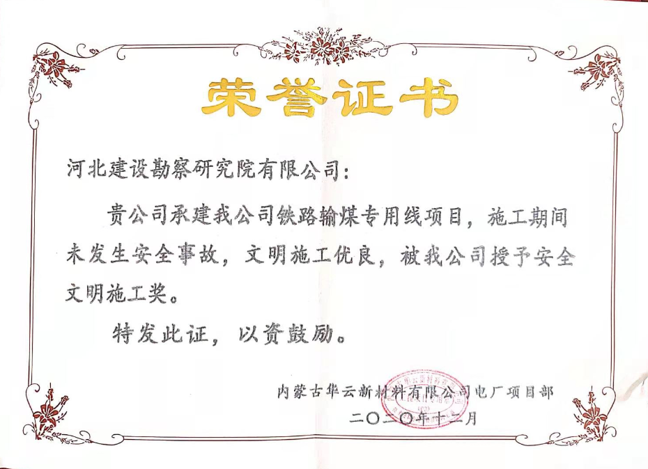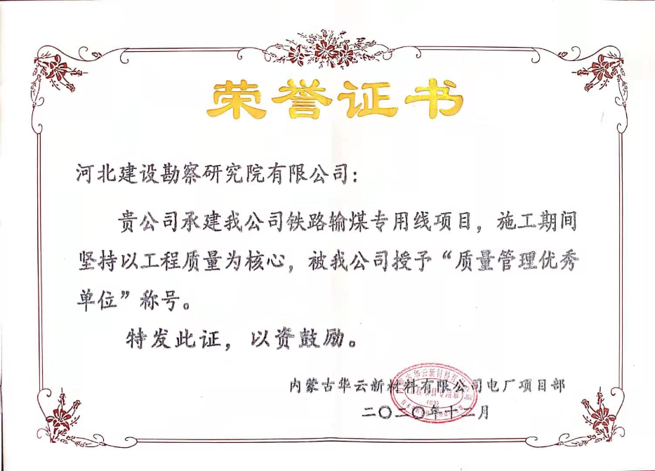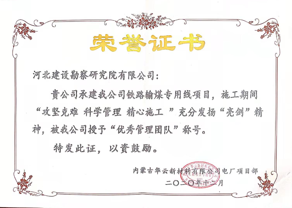 日前,由我公司承建的內(nèi)蒙古華云新材料鐵路專用線輸煤系統(tǒng)工程翻車(chē)機(jī)深基坑支護(hù)工程已順利完工。業(yè)主內(nèi)蒙古華云新材料有限公司熱電廠向我公司發(fā)來(lái)表?yè)P(yáng)函,同時(shí)頒發(fā)了“優(yōu)秀管理團(tuán)隊(duì)”、“質(zhì)量管理優(yōu)秀單位”、“安全文明施工”榮譽(yù)稱號(hào)。