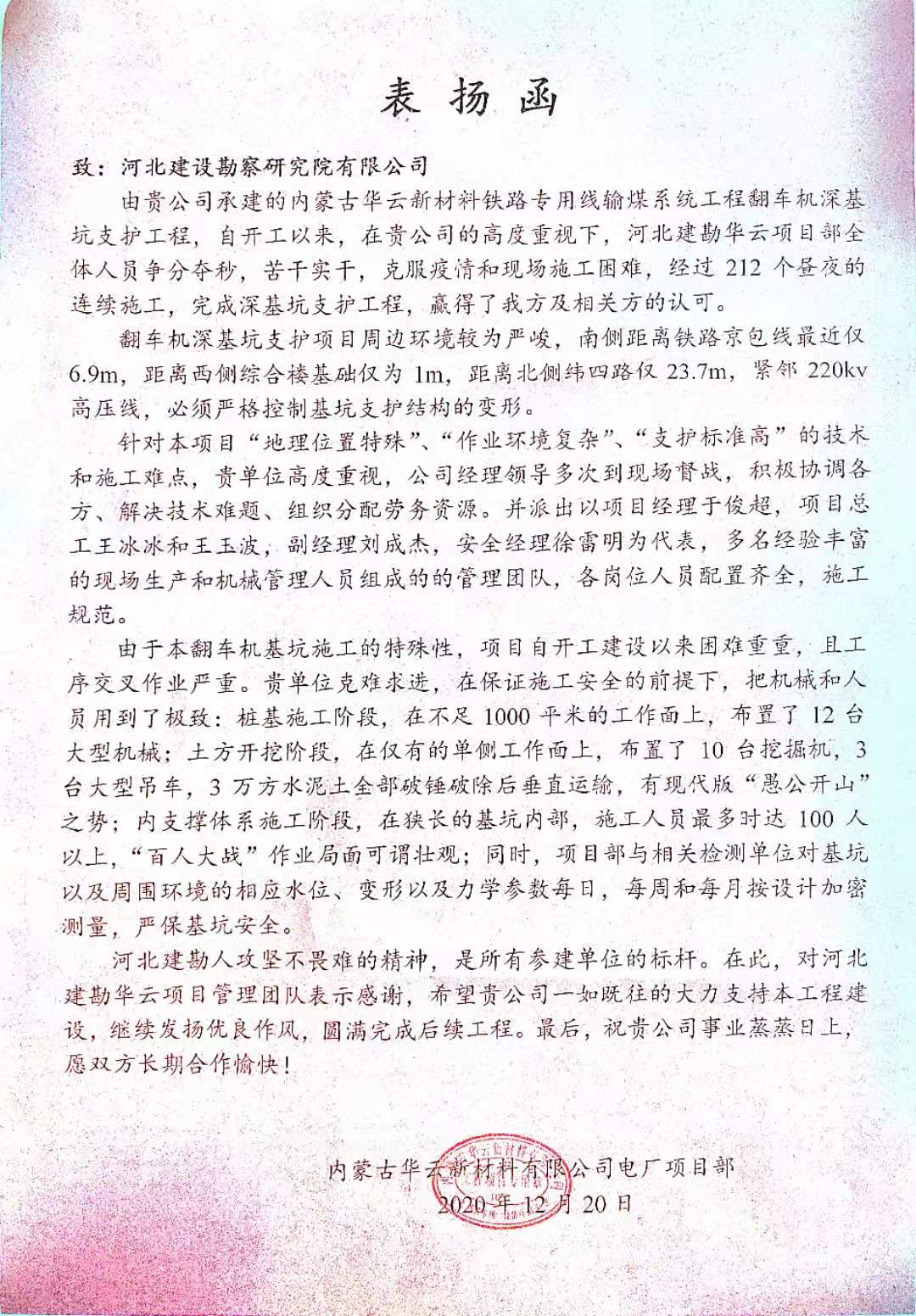 在表?yè)P(yáng)信中,對(duì)于我們河北建勘人攻堅(jiān)不畏難的精神予以了充分肯定和高度評(píng)價(jià),被認(rèn)為是所有參建單位的標(biāo)桿,并希望我公司繼續(xù)發(fā)揚(yáng)優(yōu)良作風(fēng),圓滿完成后續(xù)工程,愿雙方長(zhǎng)期合作。