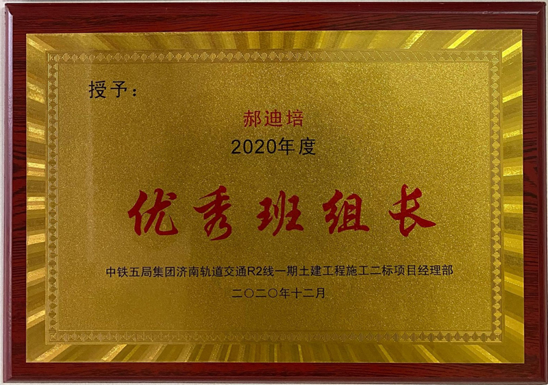 為此中鐵五局集團(tuán)濟(jì)南軌道交通R2線一期工程項目土建二標(biāo)經(jīng)理部特授予我公司“2020年度優(yōu)秀合作單位”和“郝迪培2020年度優(yōu)秀班組長” 兩項榮譽(yù)獎牌,希望我公司一如既往、繼續(xù)發(fā)揚優(yōu)良工作作風(fēng),并希望在今后的工作中,雙方精誠合作,共謀發(fā)展新篇章!