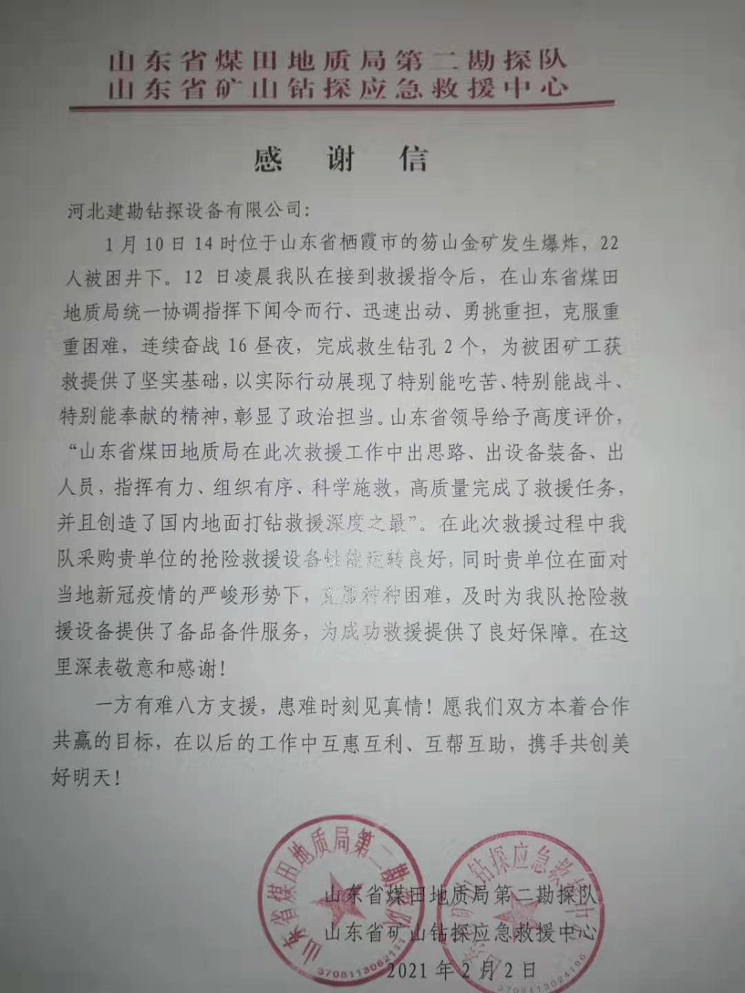 1月10日14時,位于山東省棲霞市的笏山金礦發生爆炸,22人被困井下。山東省煤田地質局第二勘探隊、山東省礦山鉆探應急救援中心連續奮戰16晝夜,完成救生鉆孔2個,為被困礦工獲救提供了堅實基礎,高質量完成了救援任務,并且創造了國內地面打鉆救援深度之最。在此次救援過程中,河北建勘鉆探設備公司提供的搶險救援設備性能運轉良好,并且在面對當地新冠疫情的嚴峻形勢下,克服種種困難,及時為救援隊搶險救援設備提供了備品備件服務,為成功救援提供了良好保障。為此,山東省煤田地質局第二勘探隊和山東省礦山鉆探應急救援中心在感謝信中深表敬意和感謝,并希望雙方本著合作共贏的目標,在以后的工作中互惠互利、互幫互助,攜手共創美好明天。