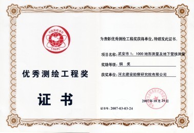由工程測量公司完成的《武安市1:1000地形測量及地下管線測量》工程獲中國測繪學會"優秀測繪工程"銅獎。