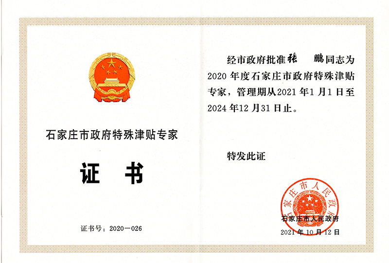經公司組織申報,石家莊市人力資源和社會保障局組織評審,石家莊市人民政府批準,我公司張鵬同志榮獲石家莊市政府特殊津貼專家稱號。