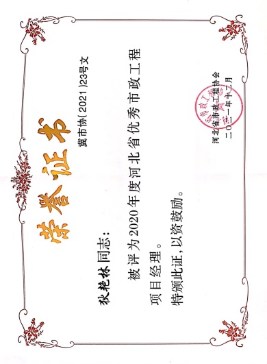 公司榮獲“河北省優(yōu)秀市政施工企業(yè)”、董事長(zhǎng)等五名同志分別榮獲榮譽(yù)稱號(hào)