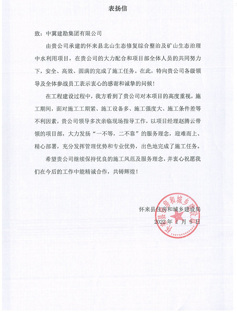 懷來縣北山生態(tài)修復(fù)綜合整治及礦山生態(tài)治理中水利用項(xiàng)目克服施工工期緊、施工設(shè)備多、施工強(qiáng)度大、施工條件差等不利因素,大力發(fā)揚(yáng)“一不等,二不靠”作風(fēng),迎難而上、精心部署,出色的完成了施工任務(wù),受到甲方領(lǐng)導(dǎo)的一致好評(píng)。