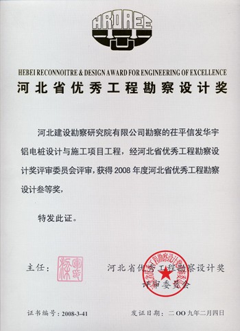 茌平信發(fā)華宇鋁電樁基設(shè)計與施工項目獲河北省優(yōu)秀工程勘察設(shè)計三等獎。