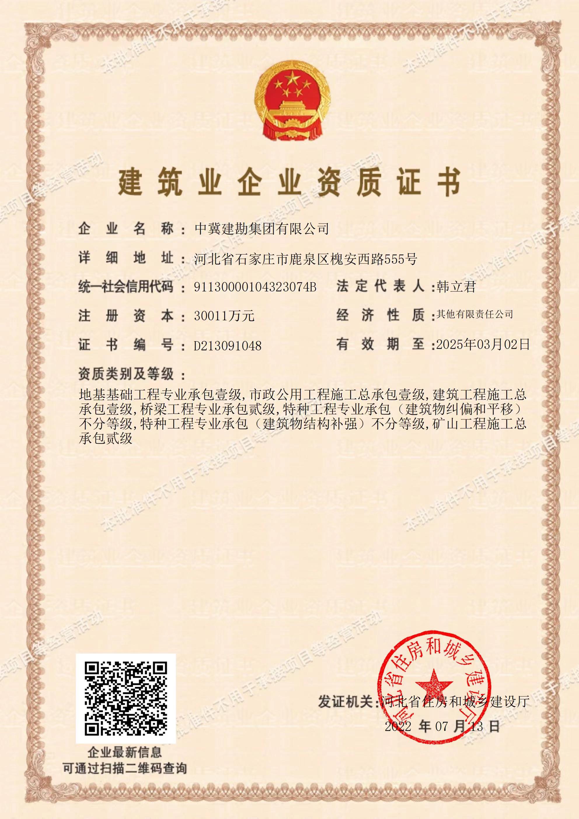 在集團公司領(lǐng)導(dǎo)的運籌帷幄下,經(jīng)過近半年的不懈努力,集團公司于2022年7月13日喜獲建筑工程施工總承包壹級資質(zhì),該資質(zhì)的取得將有力促進我公司建筑施工總承包業(yè)務(wù)開展,對公司轉(zhuǎn)型升級、地方市場開拓將起到重要作用,為公司持續(xù)穩(wěn)定發(fā)展奠定更加堅實的基礎(chǔ)。