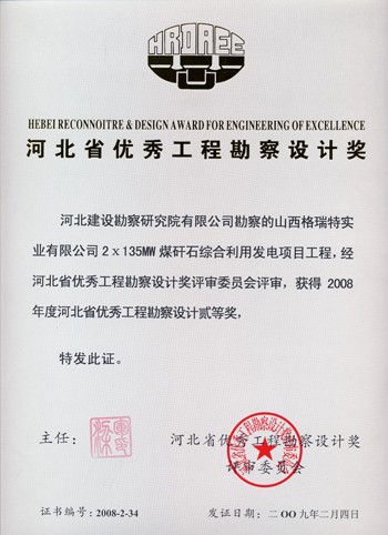 山西格瑞特實業有限公司2×135MW煤矸石綜合利用發電項目獲河北省優秀工程勘察設計二等獎。