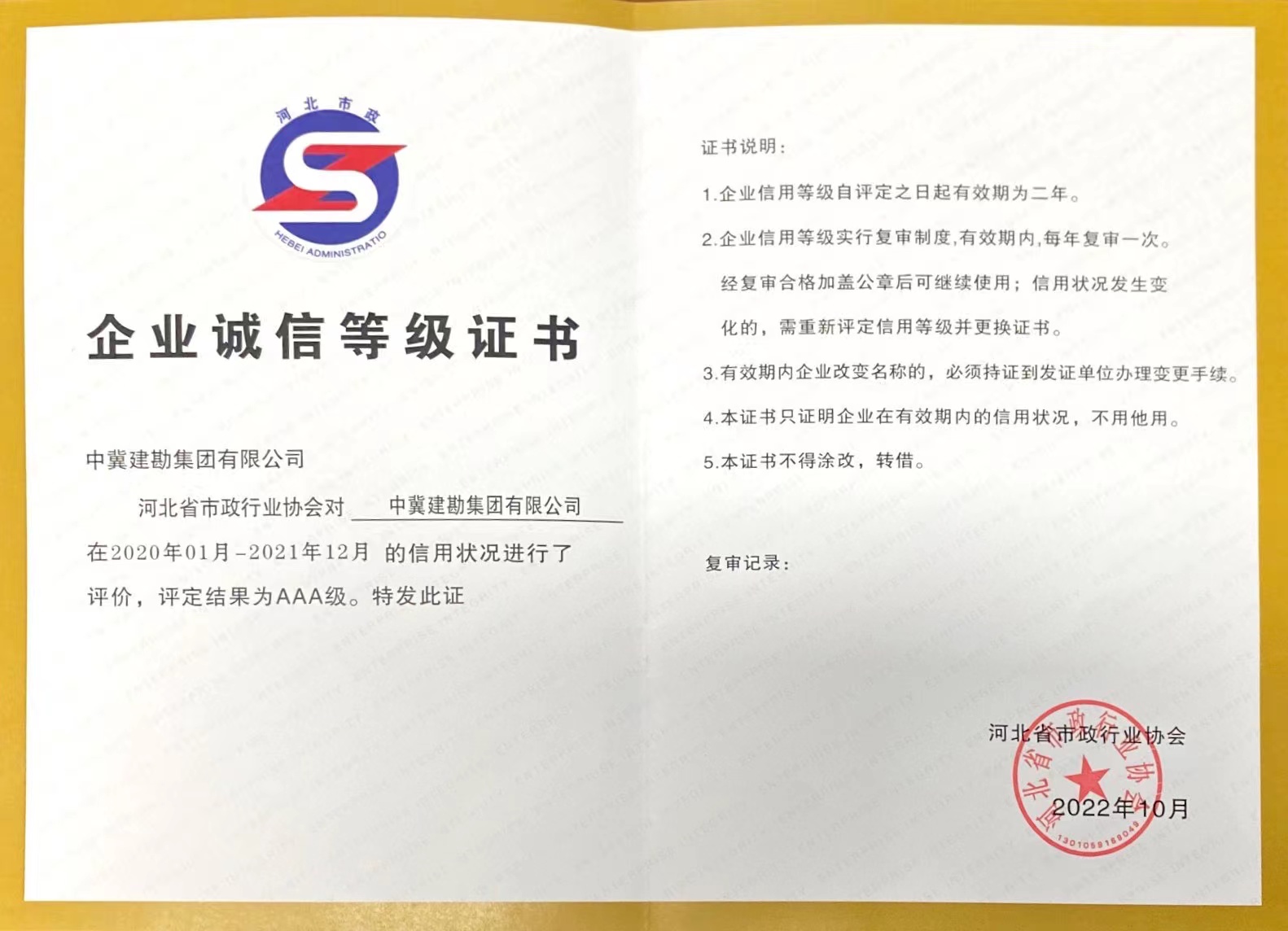 公司獲得“2021年度河北省市政行業(yè)AAA級誠信企業(yè)”榮譽稱號