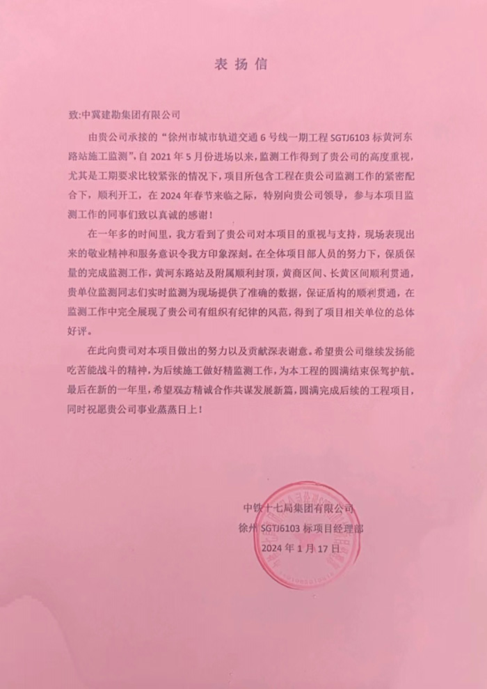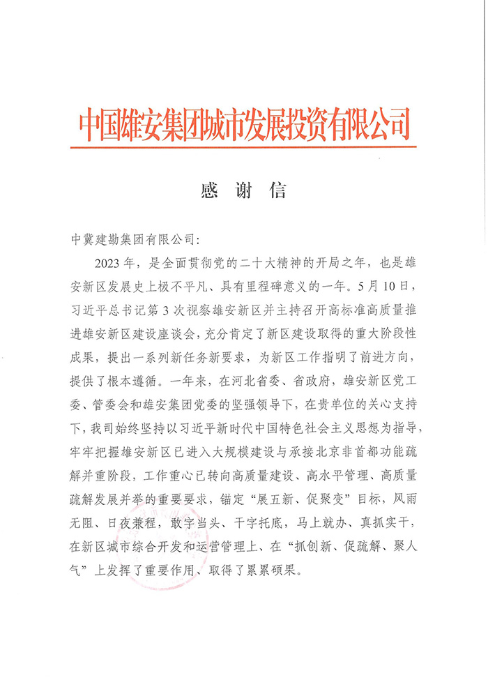 近期,集團公司陸續收到中國雄安集團城市發展投資有限公司、河北雄安軌道快線有限責任公司、中國雄安集團生態建設投資有限公司、中鐵五局、中鐵十七局、鄭州地鐵集團、內蒙古大唐國際克什克騰旗煤制天然氣電廠、大唐內蒙古多倫電廠等業主單位發來的感謝信。我公司認真負責、敢打能打硬仗的工作態度、頑強拼搏的施工風范和一心為業主服務的理念,贏得了業主的高度認可和贊揚,特發來感謝信深表感謝!