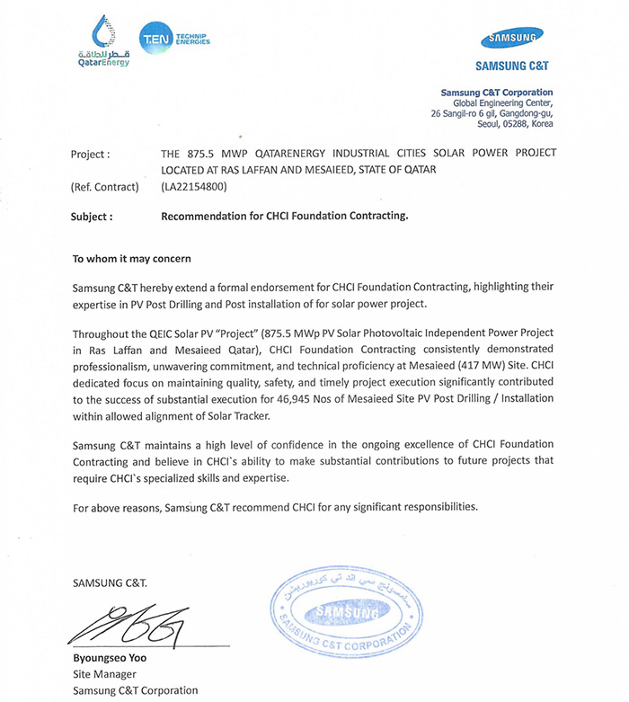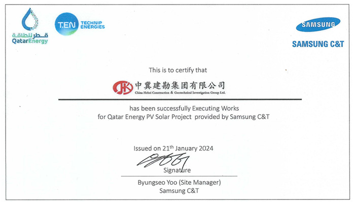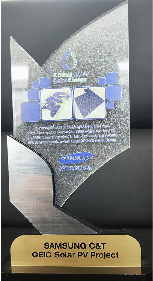 我公司收到卡塔爾能源875.5MW光伏發(fā)電項(xiàng)目業(yè)主方卡塔爾能源和總包方三星C&T公司聯(lián)合頒發(fā)的獎(jiǎng)杯和推薦信。業(yè)主及總包方高度認(rèn)可我公司項(xiàng)目履約能力,贊揚(yáng)我司對(duì)該項(xiàng)目成功交付做出重大貢獻(xiàn),表示愿意與我司建立長期合作關(guān)系。基于我司卓越的履約表現(xiàn),三星C&T公司授予我司推薦信。