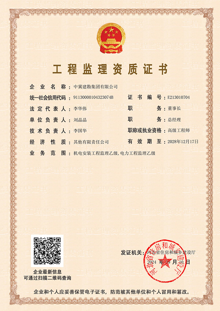 為進一步拓展公司業務范圍,完善工程監理資質類別,集團公司于2024年9月10日通過河北省住房和城鄉建設廳審核,取得了機電安裝工程監理乙級資質。