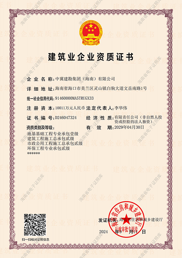 按照公司發展規劃,經過近半年的努力,海南公司于2024年9月14日通過海南省住建廳審查,成功將地基與基礎工程專業承包貳級晉升為壹級。此項壹級資質的取得,是海南公司資質實力質的飛躍,為海南公司持續發展,為公司實施“雙總部建設”,構建“一業為主,適度多元化發展”戰略打下了堅實的基礎。